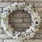 Decorative myrtle wreath is an elegant decoration that creates an atmosphere of tenderness, natural harmony and sophisticated style. The composition consists of densely arranged white flowers, reminiscent of the delicate flowering of myrtle, complemented by small green buds and leaves. Due to its realistic appearance, the wreath looks almost alive. The light color scheme makes it a universal element of decor: it fits perfectly into a modern, Scandinavian, classic or wedding interior. Such a wreath will be a beautiful decoration for the front door, wall, photo zone, festive table or spring-summer compositions.